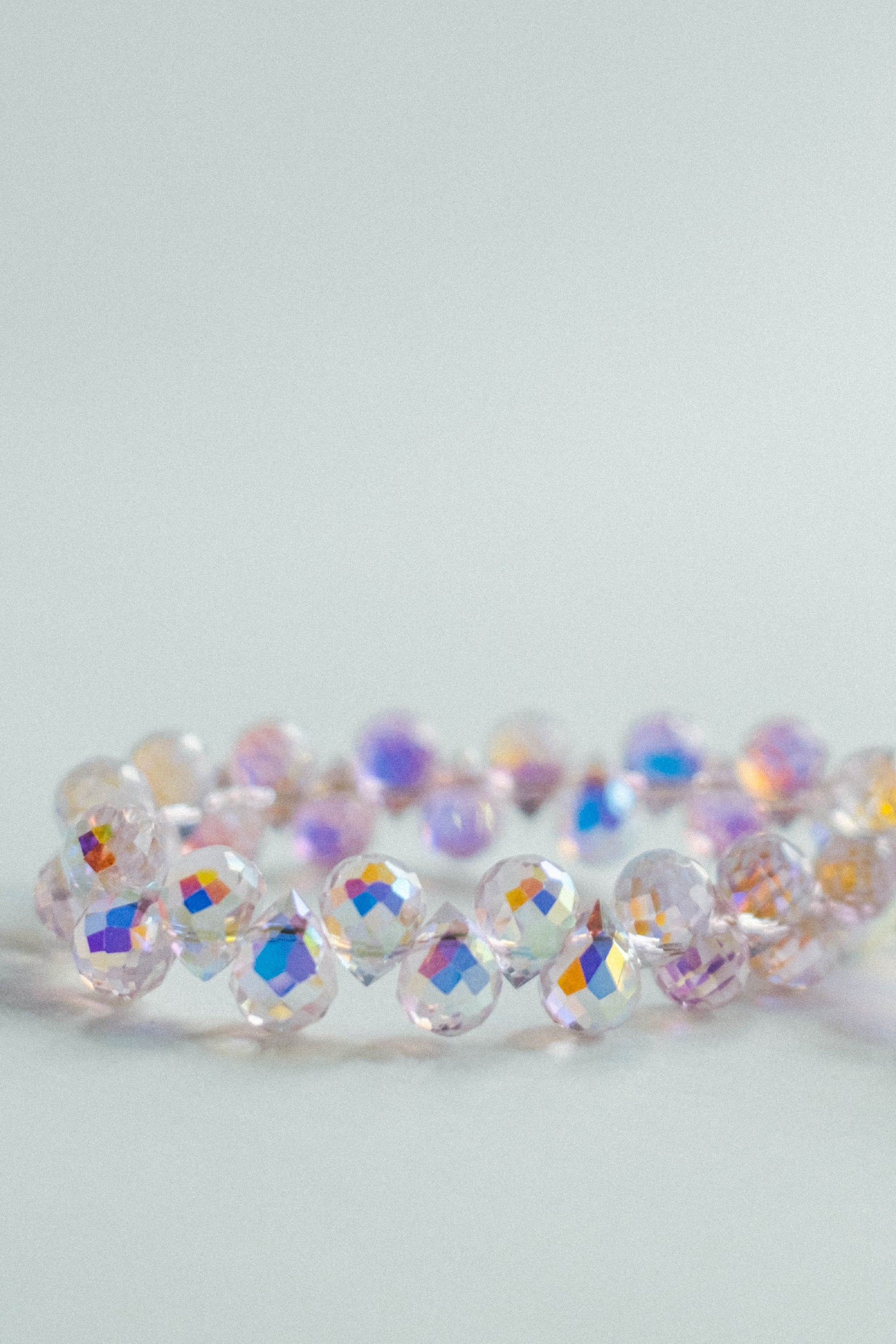 - iridescent aurora glass crystals, zinc alloy in gold tone, nylon coated stainless steel wire.