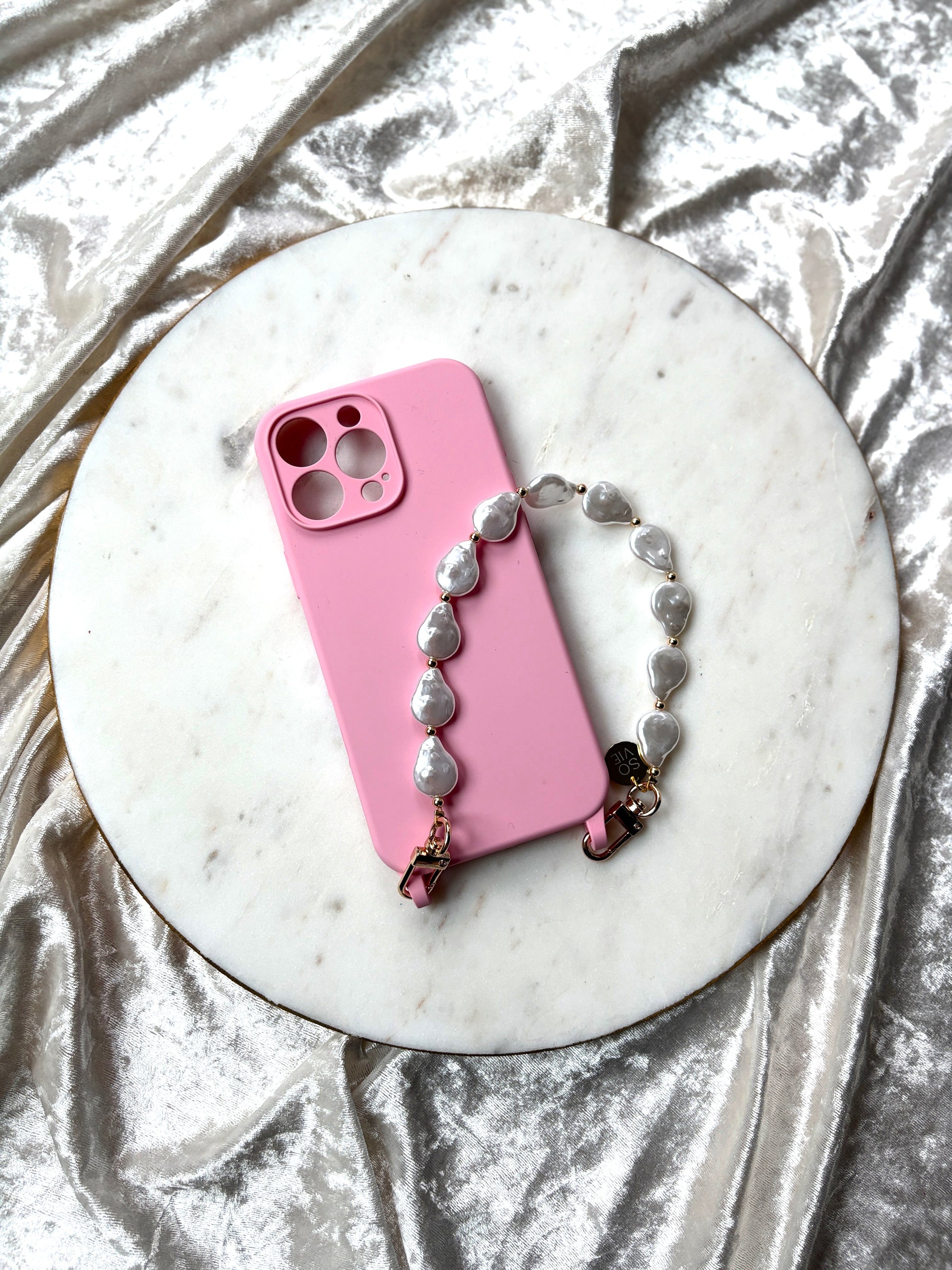 Soft-touch sturdy silicone phone case that feels good, wears well and stays clean. Built-in hooks let you clip on any SO VIE accessory with double clasps.